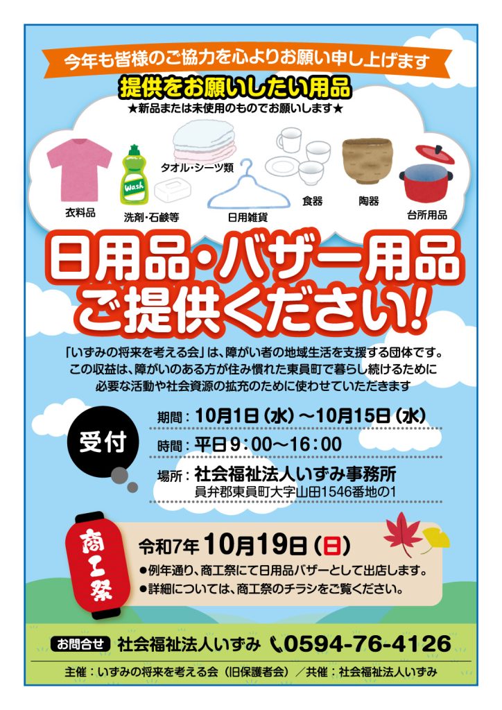 今年も商工祭にて「日用品バザー」を出店させていただきます。